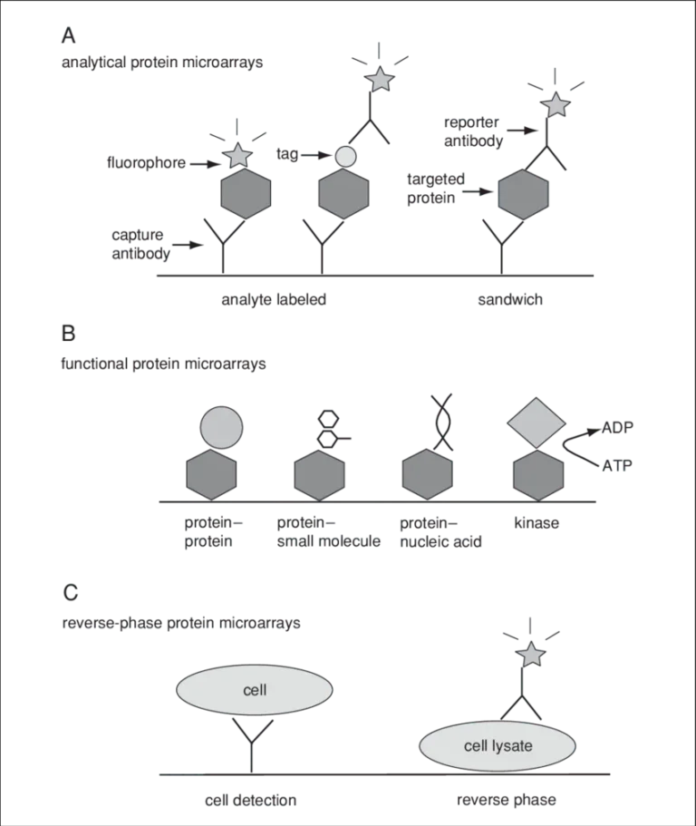 (A) Analytical protein microarrays are mostly represented by antibody arrays and focus on protein detection. In this class of microarrays, targeted proteins can be detected either by direct labeling or using a reporter antibody in sandwich assay format.